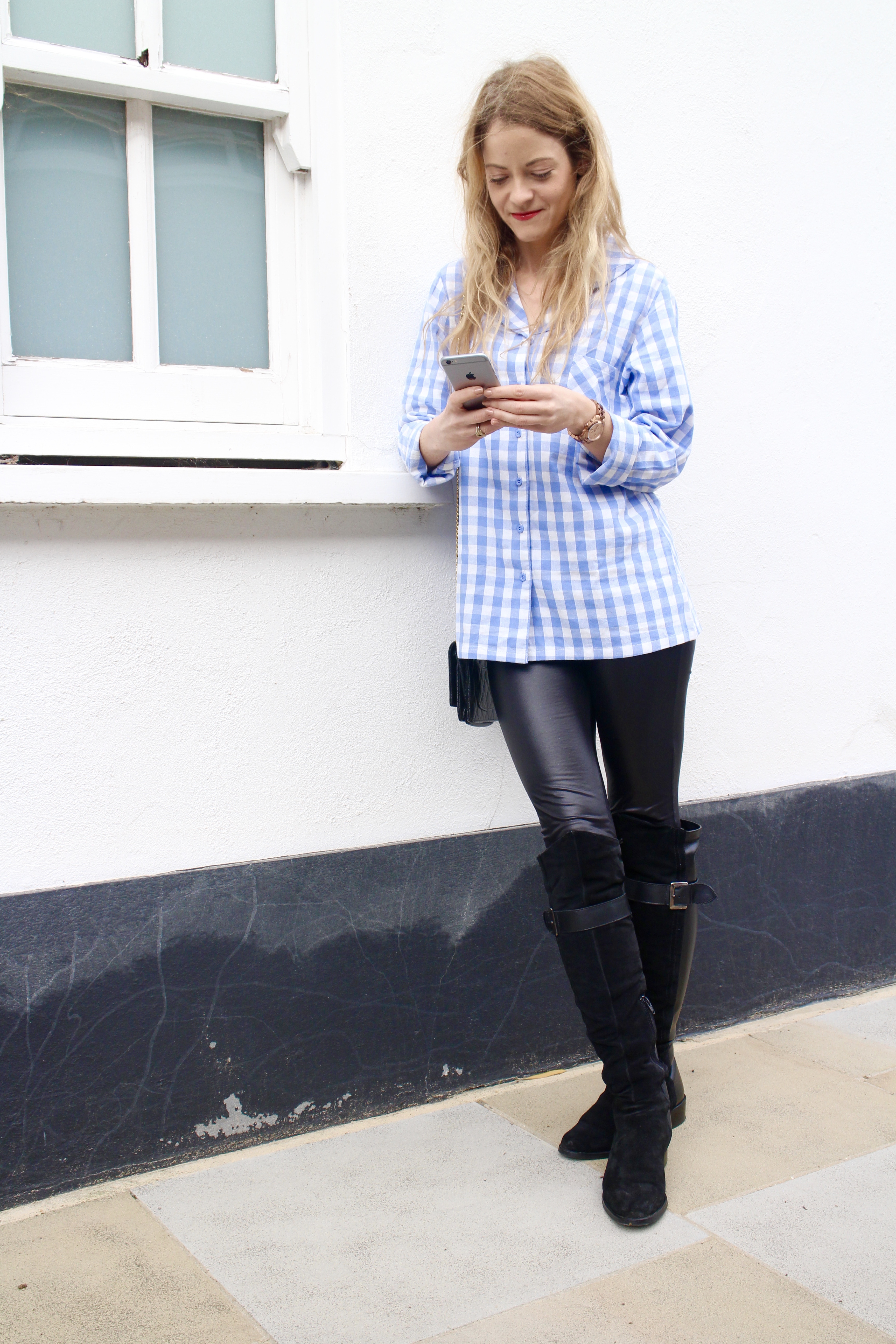 For my bedhead pyjama look, I left my hair as is (no styling whatsover), put on a dab of make-up (less than five minutes), added some leather-look leggings from New Look and topped the look off with these gorgeous Jones Bootmaker Pennie S knee-high boots.